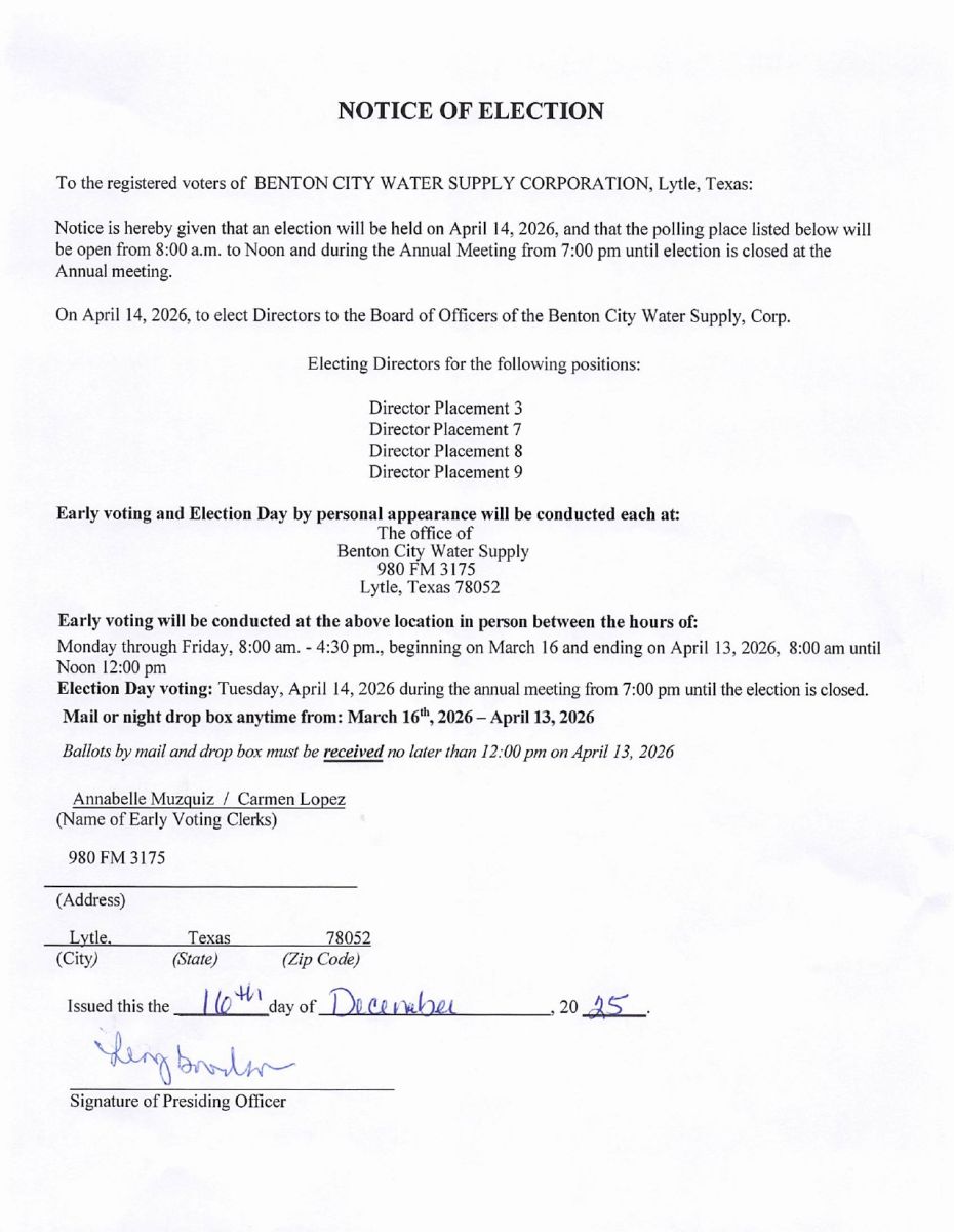 Welcome to Benton City Water Supply Corp. in Lytle, Texas