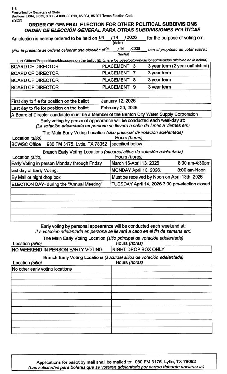 Benton City Water Supply Corporation is experiencing a 500 GPM water production shortfall due to reduced capacity at one of our main wells. While a new well has been constructed, it will not be in service until Early 2026.